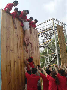 最后一個(gè)是“畢業(yè)墻”項(xiàng)目,在該項(xiàng)目中需兩個(gè)隊(duì)合二為一,4 米多高的“畢業(yè)墻”,要求所有隊(duì)員不借助任何外力的情況下全體員工都翻越過去,這對于整個(gè)團(tuán)隊(duì)來說都是非常嚴(yán)峻的考驗(yàn)。