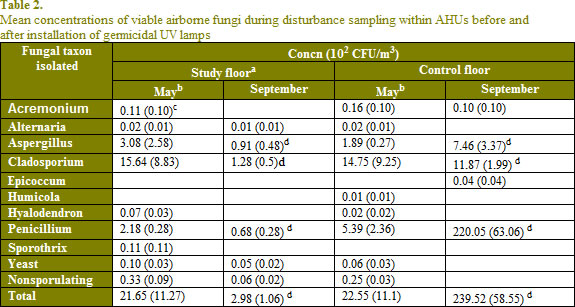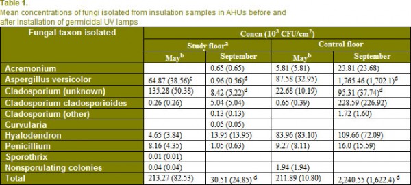 前的UV燈被啟動,在五月,意味著從兩個層上的絕緣層的總真菌濃度類似的類型和數(shù)量(見表1),而研究地板上可行的真菌在空調(diào)機組的總濃度在秋季和控制樓顯著的不同。